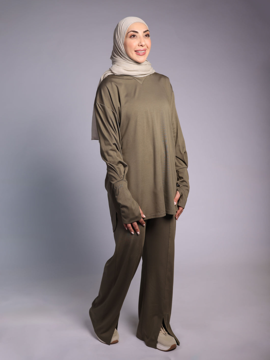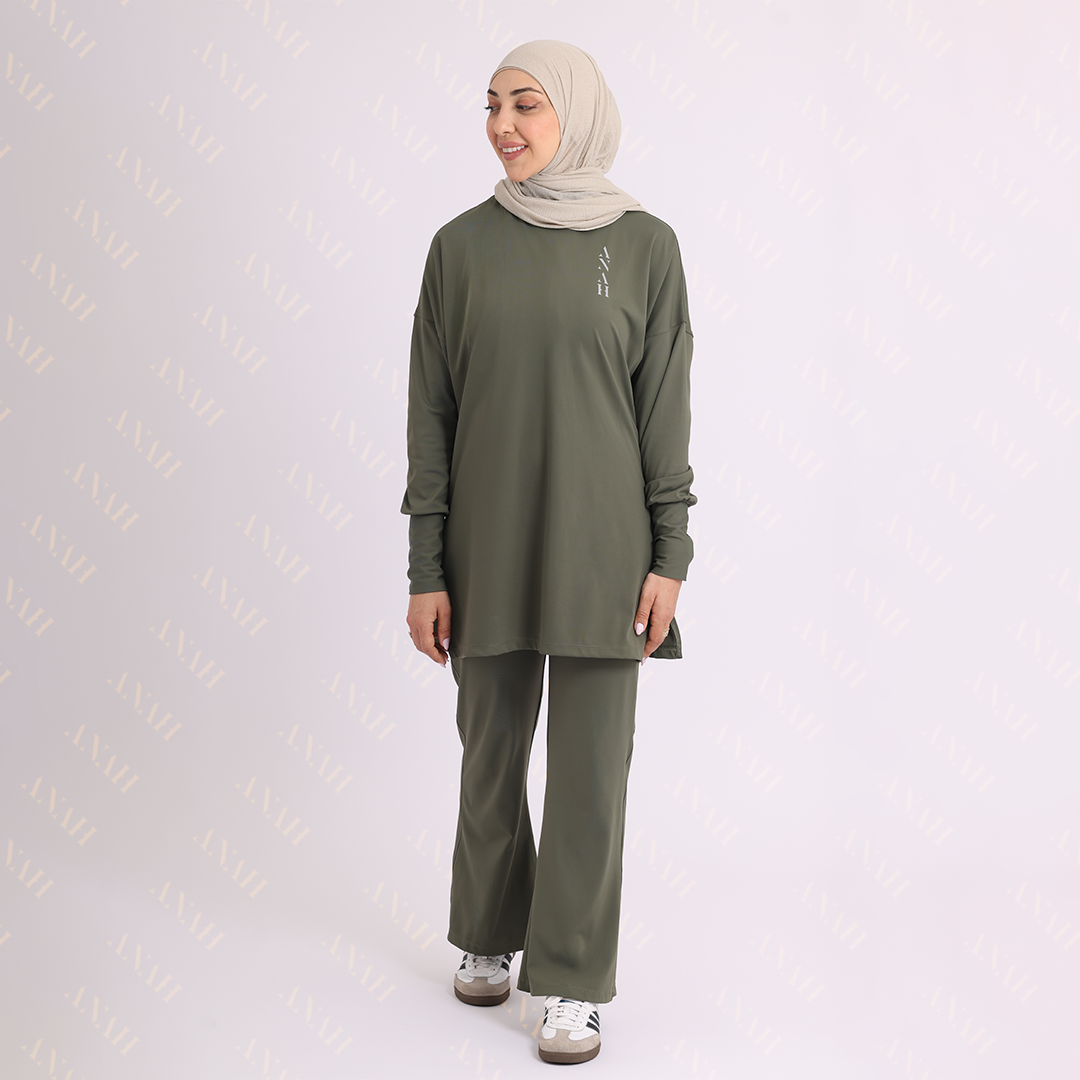 Styled athletic top made of soft premium sportswear material, with matching mini flare yoga pants...